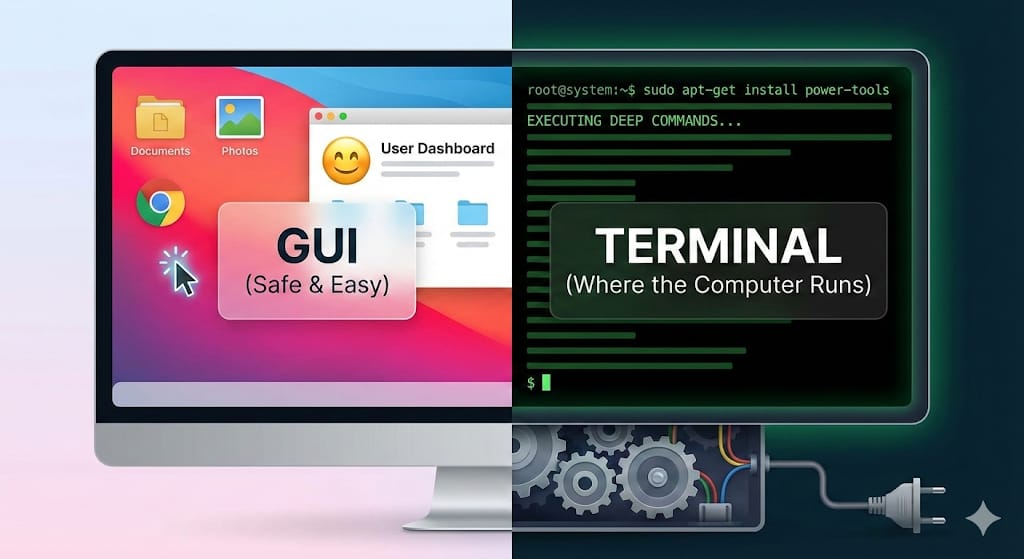 To understand the power here, you need to understand the environment. Most people interact with computers via the GUI (Graphical User Interface). This is your dashboard. It has icons, windows, and mouse clicks. It is designed to be safe and easy, which means it hides 90% of what the computer can actually do. The Terminal is the text-based interface below the graphics. It is where the computer actually runs.